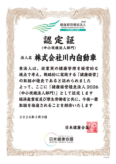 株式会社川内自動車は、昨年に引き続き、経済産業省と日本健康会議が共同で実施する「健康経営優良法人2026(中小規模法人部門)」に認定されましたので、お知らせいたします。